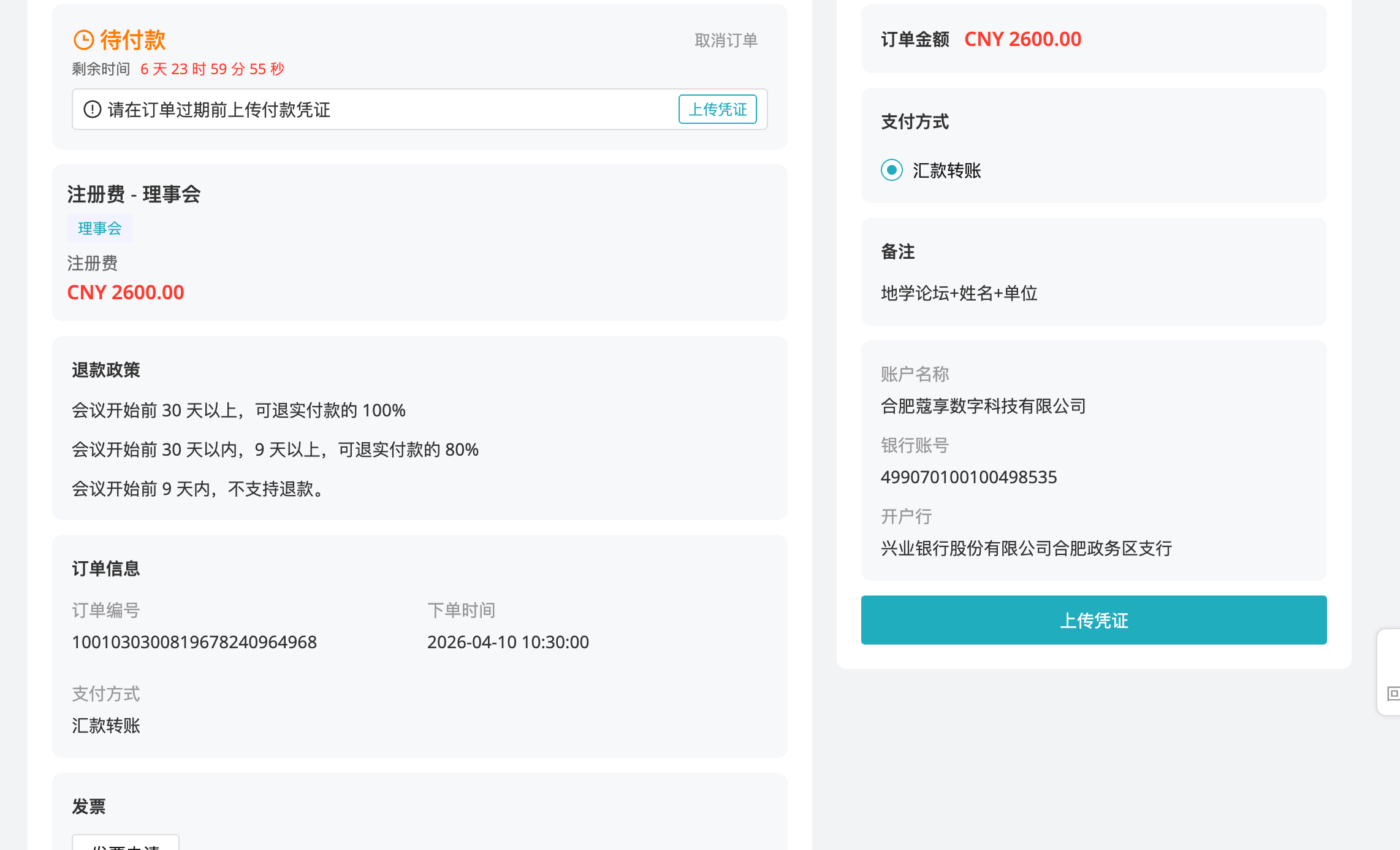 注:通过银行转账缴纳注册费时,请务必备注“青年地学论坛+姓名+单位”,如涉及多人一起汇款,请备注所有付款人信息。通过银行转账缴纳注册费的与会代表,请尽快按照上述方式提交转账成功的回执,以便会务组及时确认您的注册费支付情况。